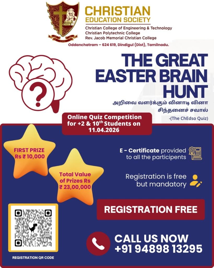 The Christian College of Engineering and Technology is located in Oddanchatram, Dindigul District of Tamil Nadu, in the low range of beautiful Kodaikanal hills. The institution has good academic and extra curricular facilities with well qualified faculties. The College has sophisticated laboratories, a well furnished library and good computing facilities.